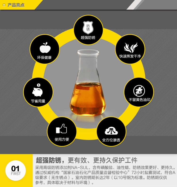 本品廣泛用于各類管材加工、汽配生產、機械制造等行業的金屬制品防銹,本品干燥速度快,油膜光亮而結實,可大大提高工作效率和產品質量,是現代機械加工行業的理想產品。