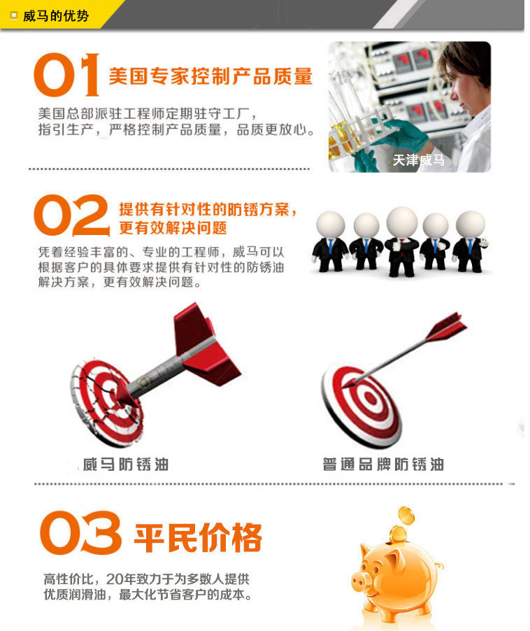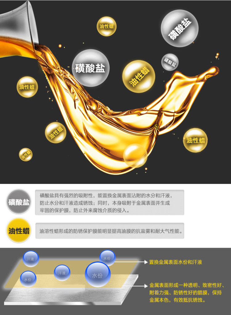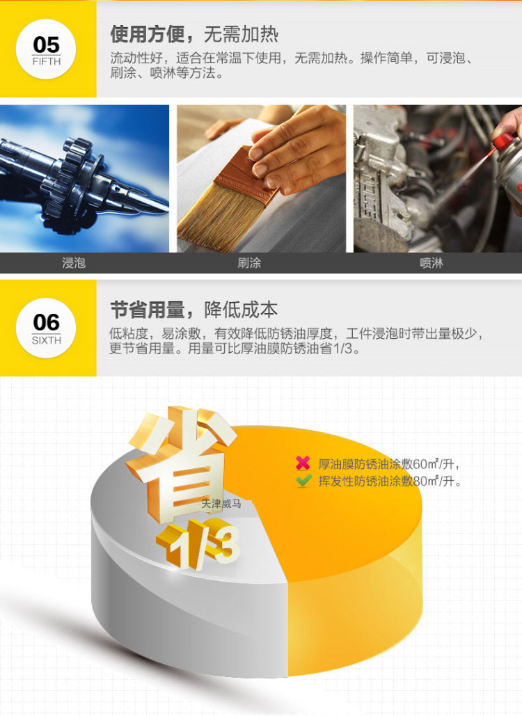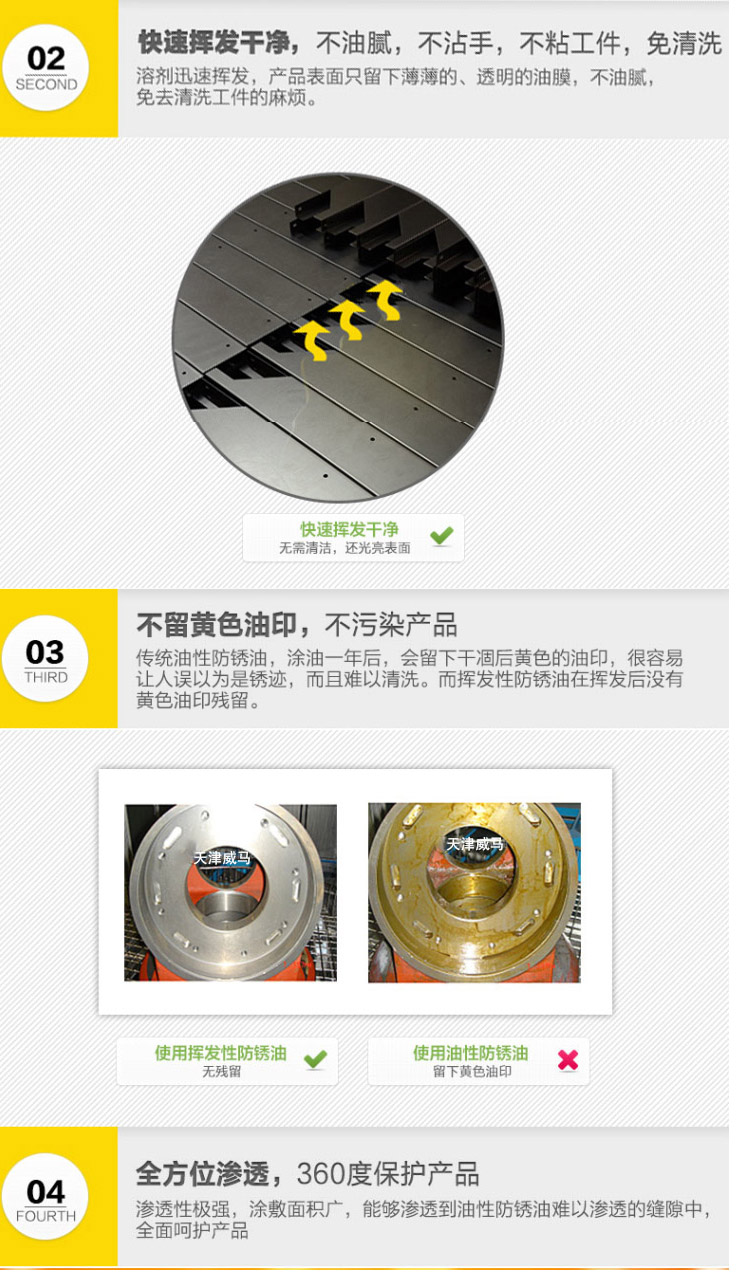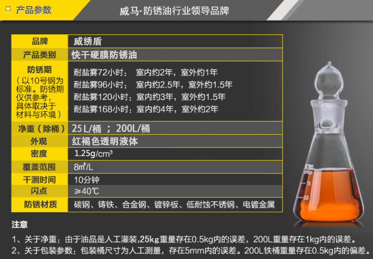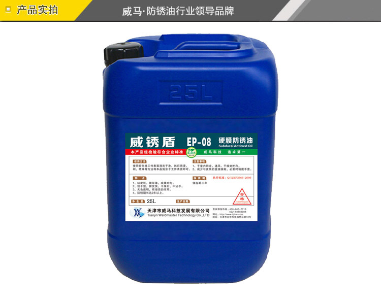 威銹盾EP-08硬膜防銹油是一種無色透明低粘度液體防銹專用品,以樹脂為成膜材料,加入高分子防銹添加劑并用精致石油溶劑配成的防銹油。本品在金屬表面成膜迅速、油膜堅固、透明而均勻,決不沾手,有良好的耐磨耐熱性能,防銹時間持久。可在各種環境下長期保存不銹蝕。本品使用簡便,設備簡單,刷、浸、噴均可,不遮蓋器件原色,并有增光作用。EP-08硬膜防銹油為本公司的招牌產品。經測試,可以替代進口同類產品,歡迎測試,選購。